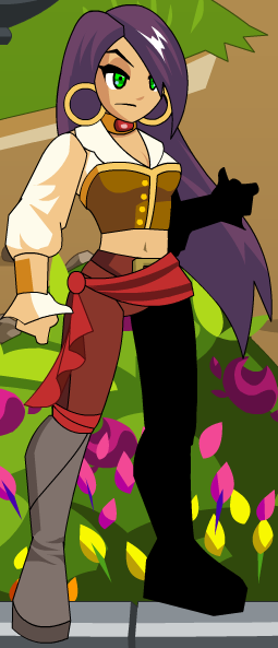 Es una chava de pelo morado con aretes grandes y circulares ojos verdes y un collar con un diamante en el medio